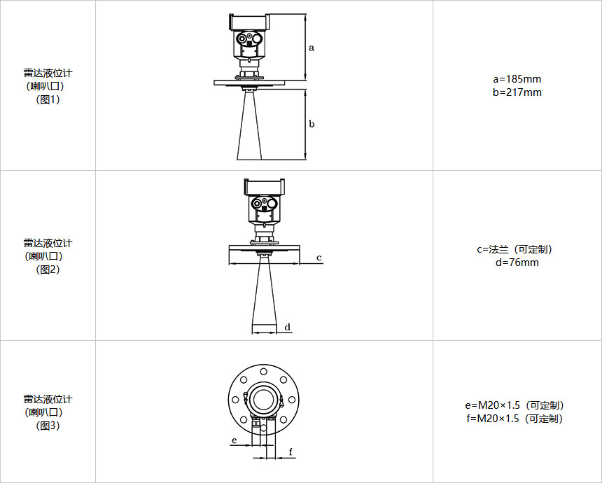 安裝要求:一般采用標準法蘭安裝到罐頂,也可采用旁通管安裝,導波管安裝等多種方式。高頻雷達放置在罐體直徑的1/4或1/6處,距罐壁不小于200mm,26G天線伸入到罐里至少10mm;測量錐形罐體,應安裝在錐形罐體平面的中間,保證可以測量到錐形頂部;測量有堆料的罐體,法蘭選型應選擇萬向法蘭(可調節(jié)方向)。