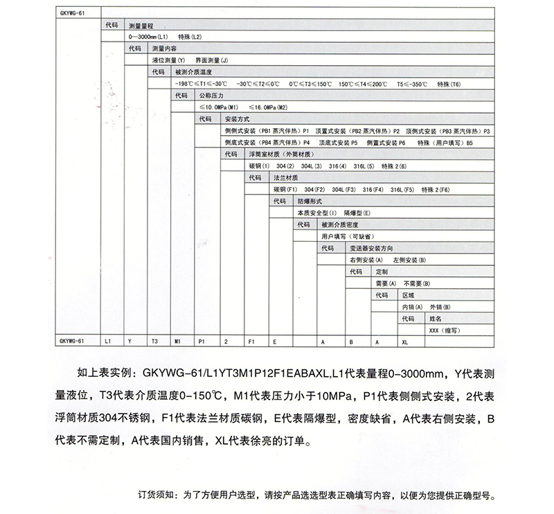 GKYWG-61電動浮筒液位計(jì)是采用了國外技術(shù)及零部件研制組裝的新型液位測量儀表,該儀表搭載了先進(jìn)微型計(jì)算機(jī)系統(tǒng),除了具有高準(zhǔn)確度、低漂移等優(yōu)點(diǎn)外,還可對測量過程的溫度和密度進(jìn)行自動補(bǔ)償,同時可調(diào)整量程范圍,適合多種工況的液位界位測量。本產(chǎn)品具有防爆性,結(jié)構(gòu)簡單,性能穩(wěn)定,安裝方便??蓮V泛用于石油、化工、冶金、電力及鋼鐵行業(yè)。GKYWG-61型電動浮筒液位計(jì)可用來測量液位、界位和密度,不但能輸出4~20mA的標(biāo)準(zhǔn)電流信號,也能利用HART通訊協(xié)議隨時讀取,對過程操作當(dāng)中用戶所需要的信息又可在傳輸線的任意一點(diǎn)對其進(jìn)行調(diào)校。
